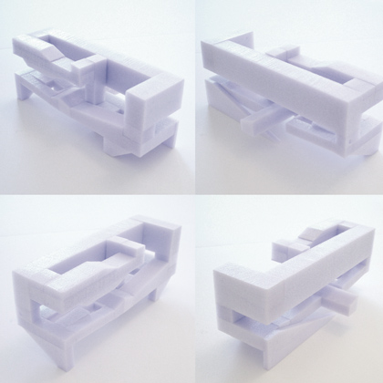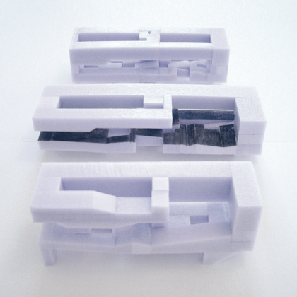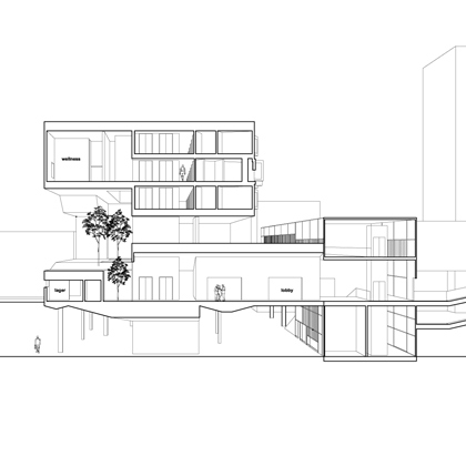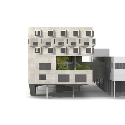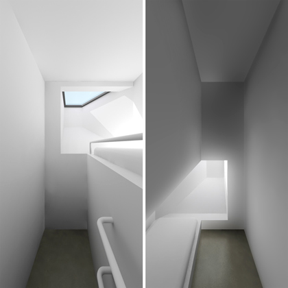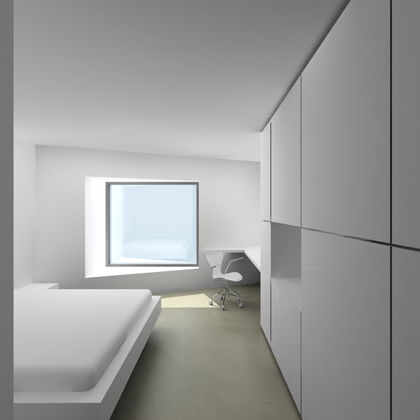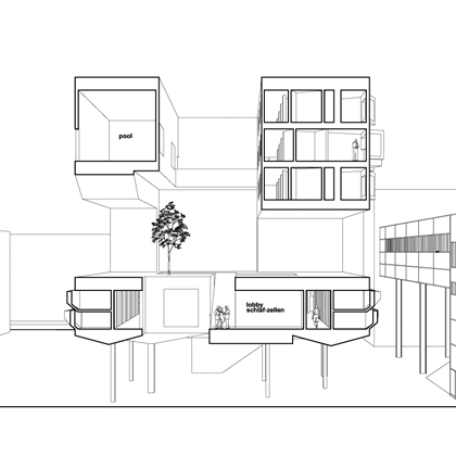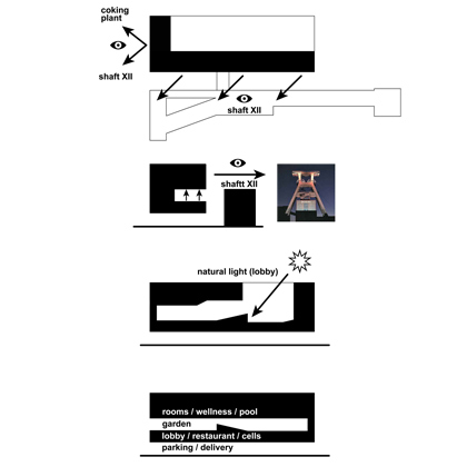 Approaching from the driveway the old lory ramp leads the visitor to the elevated level one of the old building where he also meets the walkway that was used by the miners to reach shaft XII. Emerging from this position the lobby bridges the new and old building. The whole new building therefore rests on pillars. In order to serve differing types of visitors the dormitorium hosts three accommodation types: minimal sleeping cells, double rooms and suites. Together with the lobby, a restaurant, a service and administration area the sleeping cells are located on level one. Somewhat decoupled from this rather lively area the two more exclusive room types can be found on levels three to five. Ascending above the neighboring Wagenumlauf these rooms permit an unobstructed view on shaft XII.