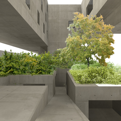 Level two in between serves as free space enabling a natural illumination of the lobby and all other usages of level one. As sort of a wild garden with a typical vegetation of the surrounding area it tunes into the ruin like character of the historical mining area and offers visitors a recreational refuge.