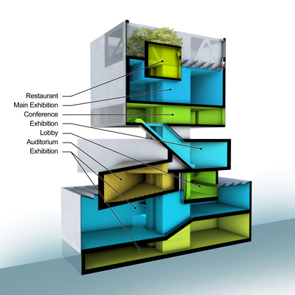 In addition to a main hall for changing exhibitions, the competition program required also the inclusion of several smaller showrooms, an auditorium, conference rooms, a lobby and a restaurant.