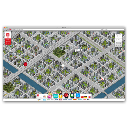 Inside the pavilion visitors could create their individual house complexes by means of concerted movements in an interactive shadow play developed at RWTH Aachen. The website generated for that purpose not only recorded each individual event in terms of a parametrically represented house generated by the person’ shadow image, but enables in the course of the Expo also the becoming of a huge virtual pixel city – the „DuC City“.