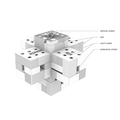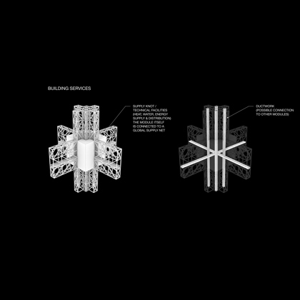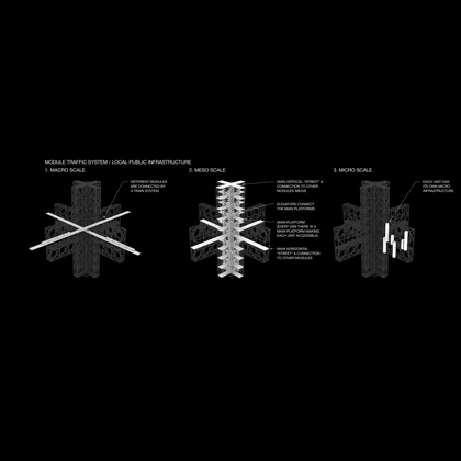 In a world of permanently growing population we therefore have to deal with the issue of finding a way to establish a higher urban density than presently encountered without degrading life environment. So this design does not aim at creating a single building complex to solve these problems but rather proposes the functionality of a network of a three-dimensional infrastructure organized in a horizontal and vertical street grid.