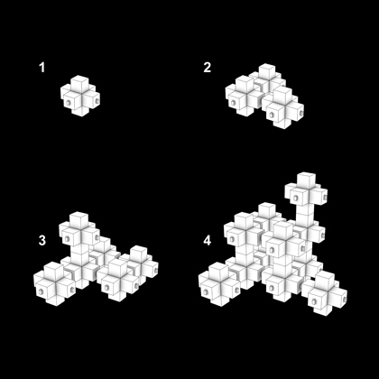 The network is based on a modular system where each module can be viewed as a "quarter". It can grow by adding framework modules in the first step which can be colonized by attaching units (houses) in the second step.